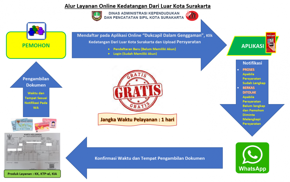 Kartu Keluarga Tujuan/Surakarta, jika: a) Datang numpang di KK Surakarta, atau; b) Datang sekaligus membentuk keluarga baru setelah menikah & salah satu suami/istri adalah warga Surakarta.